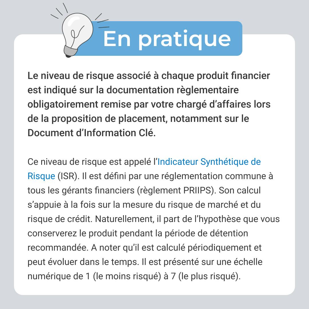 Ainsi, pour un placement à court terme, il est préférable de privilégier un placement peu risqué, la contrepartie est une espérance de rendement moins élevée. Mais pour un placement à plus long terme, le capital placé sera immobilisé pendant une période pouvant aller jusqu'à plusieurs années, en contrepartie d’une espérance de rentabilité plus élevée.