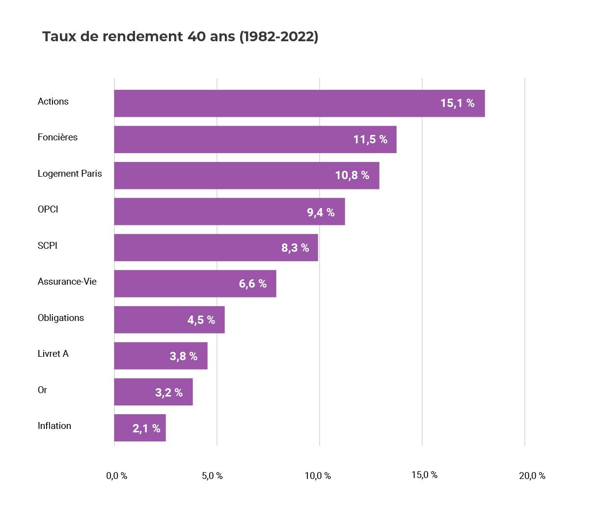 Ce graphique représente les performances (en rendement annuels) de différentes classes d'actifs, entre 1978 et 2018, en France. Il permet de mettre en évidence le lien entre horizon de placement, risque et rentabilité.