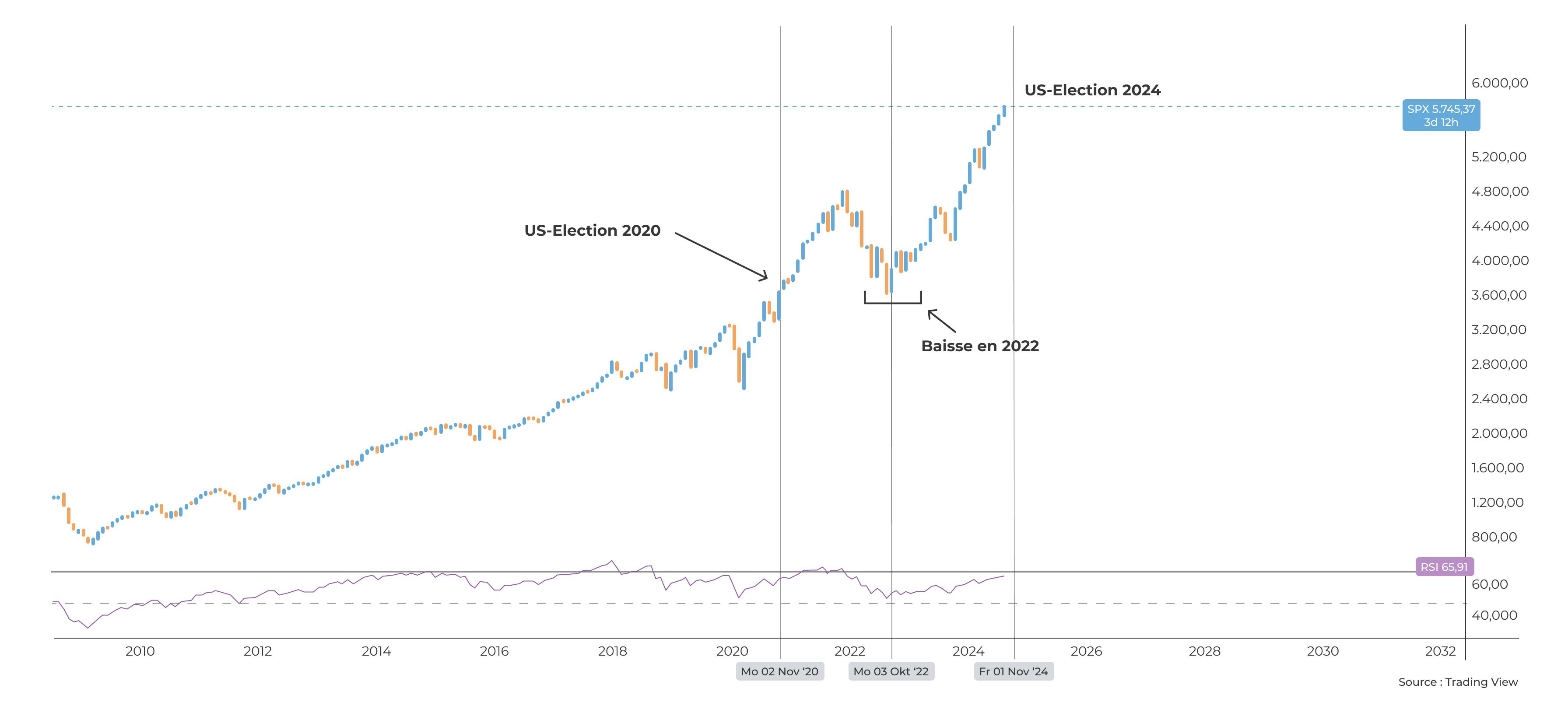 D’autre part, les marchés ne sont ni rouges (Républicains) ni bleus (Démocrates) (“markets aren’t red or blue” en anglais), et les évolutions apolitiques du S&P500 nous le suggèrent. Les hauts et les bas des marchés dépendent davantage d’événements conjoncturels inopinés, plutôt qu’à la couleur politique du président américain. L’exemple le plus parlant étant la guerre entre la Russie et l’Ukraine, qui provoqua une hausse inédite de l’inflation et un marché baissier sur l’année de mi-mandat de Joe Biden en 2022.